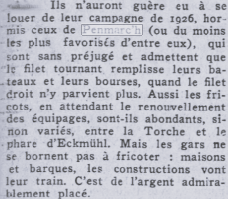 Les ports de Penmarc’h ont réalisé 11 504 000 F de chiffre d’affaires, soit deux fois plus qu’en 1925. Contrairement aux autres ports, la campagne sardinière a été favorable à Saint-Guénolé.